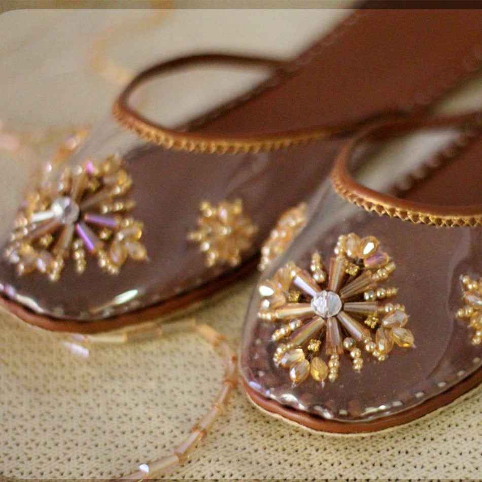 The elegance of champagne crystals and the charm of clear footwear ✨ a must have pair that goes perfectly well with eastern or western attires.. Genuine leather comfy sole guaranteed